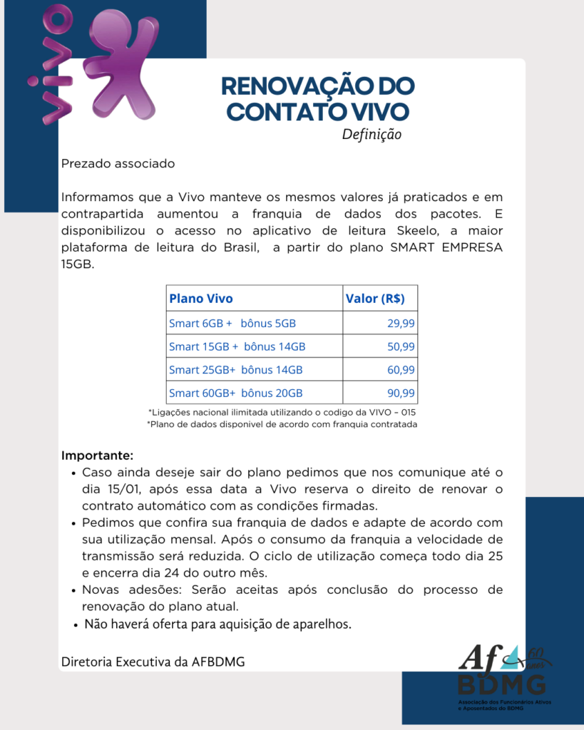 Informamos para os usuários do plano Vivo/AFBDMG que já foi definido as novas tarifas para a renovação do contrato.