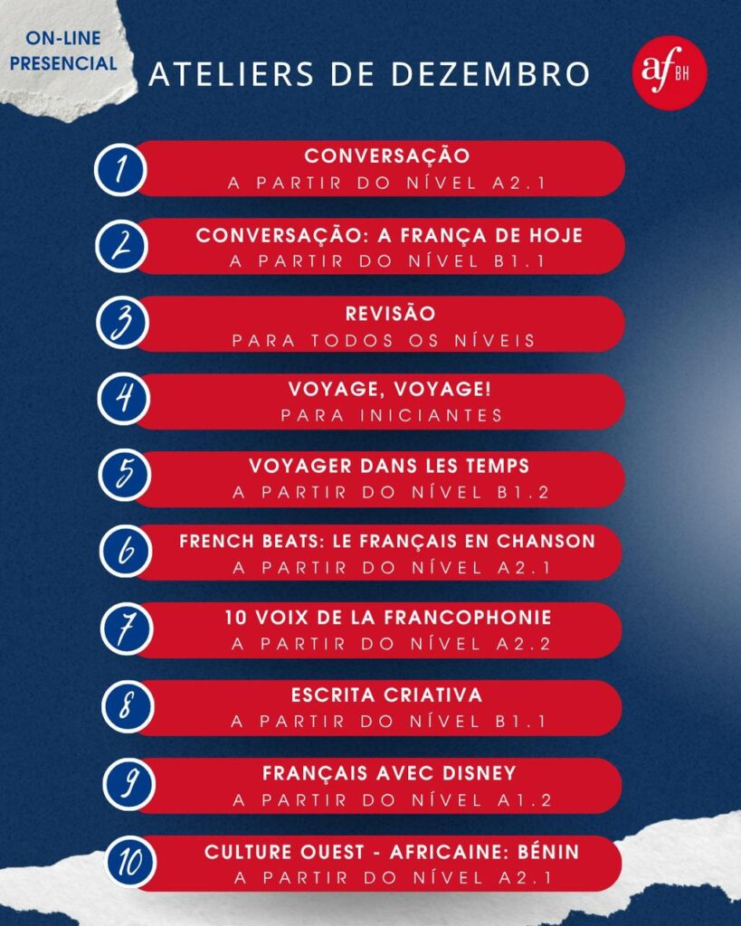 A Aliança Francesa de Belo Horizonte preparou uma programação especial para dezembro: 10 temas incríveis, com nossos professores supercompetentes, para você continuar aprendendo francês de forma leve, divertida e eficiente!